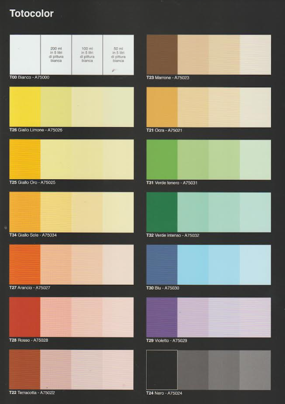 A Totocolor színkártya a Casati normál, fehér, beltéri falfestékre van meghatározva (5 literhez adagolandó 50, 100 vagy 200 ml mennyiségben).